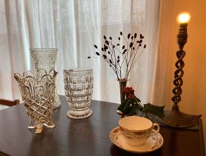 画像では小さなデスク(サイドテーブル)に合わせていますが、ダイニングテーブルやサイドボードの上、玄関などにも。
