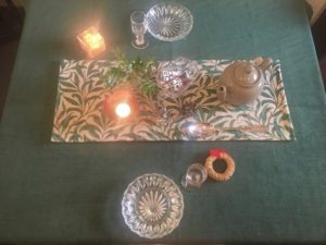 家具の上や玄関(靴箱)の上に敷いて、アンティークのガラス花器に千両や松など‥‥お正月の花を生けてみては?