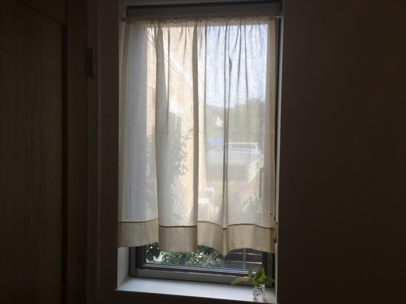 冬には光をたくさん取り込みたいから、薄手や丈の短いカフェカーテンをつけ、夏の陽射しに変わるとなるべく窓全体を覆います。